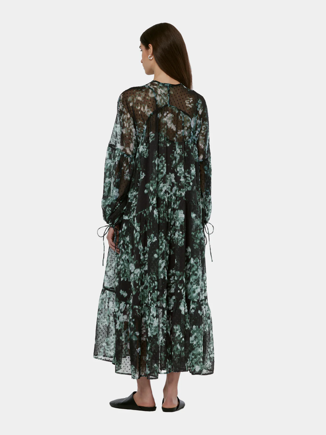 Flow through your day in this sheer, v-neck maxi dress featuring dramatic sleeves and a captivating floral pattern. It's graceful and effortlessly stylish.